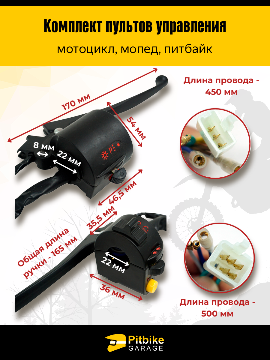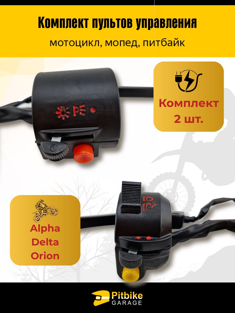 Комплект пультов управления с проводами для мотоцикла, мопеда, скутера, квадроцикла – универсальные ручки 22 мм, Поворотники, свет, сигнал, Пульт левый и правый Универсальный комплект ручек управления для мотоцикла/мопеда/скутера/квадроцикла – незаменимый аксессуар для каждого мотоэнтузиаста. Пульты управления позволяют удобно контролировать функции освещения, поворотников, звукового сигнала и электросистемы. Устанавливаются на руль диаметром 22 мм. Изготовлены из прочного, устойчивого к износу пластика с влагозащитной изоляцией проводов, что обеспечивает длительный срок службы даже в условиях повышенной влажности, пыли и вибраций. Основные характеристики: Диаметр: 22 мм (подходит под стандартный мото/скутер/мопед руль) Длина проводов: левая ручка — ≈500 мм, правая ручка — ≈450 мм Ширина блока: 35.5 мм / 46.5 мм Высота: 57 мм / 52 мм Подключение: разъемные штекеры (на фото) Материал: ABS-пластик, медные контакты Вес: около 420 г Функции левого блока: Поворотники (влево/вправо) Дальний/ближний свет Звуковой сигнал (клаксон) Функции правого блока: Габаритные огни Кнопка выключения двигателя / зажигание Универсальный переключатель (например, для стартера) Преимущества: Подходит для большинства моделей китайских скутеров, мопедов, питбайков, мотоциклов (Alpha, Delta, Racer, Irbis, Motoland и др.) Простая установка без пайки – подключение через стандартные разъемы Прочная сборка, эргономичный дизайн, высокая износостойкость Устойчивость к влаге, пыли, вибрациям Отличная чувствительность переключателей, отзывчивое управление Применение: Идеально подходит для замены штатных пультов управления, особенно если оригинальные кнопки вышли из строя. Поддерживает базовые функции для ежедневной эксплуатации. Подходит для городской и загородной езды, в том числе в дождь или холод. Комплектация: левая ручка с пультом + правая ручка с пультом + кабель с разъемами Совместимость: руль диаметром 22 мм Идеально для самостоятельной установки