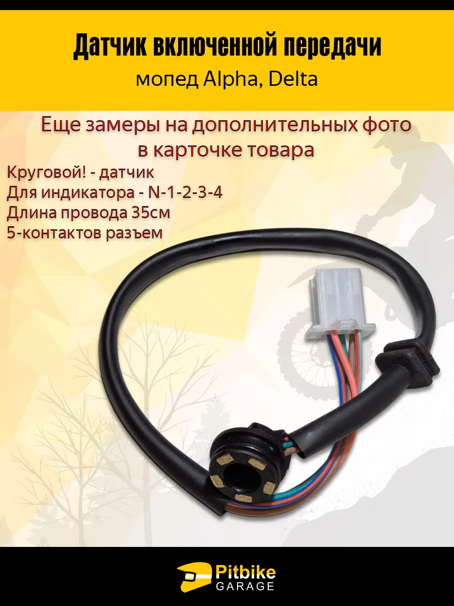 Корпус датчика выполнен из прочного пластика, устойчивого к вибрациям, перепадам температур и воздействию влаги. Длина провода — 34 см, общая длина изделия — 38 см, внешний диаметр датчика — 22 мм. Разъём с 5 контактами обеспечивает стабильное соединение с бортовой электроникой, а точная передача данных гарантирует корректное отображение включенной передачи на индикаторе: N-1-2-3-4.