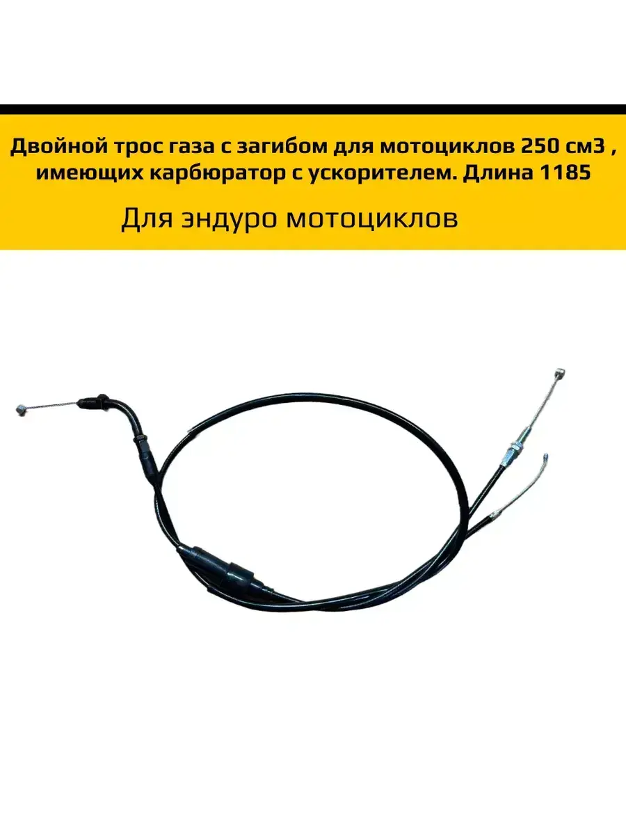 Двойной трос газа для эндуро 250 см³ с карбюратором-ускорителем — надёжное решение для плавного и точного управления дроссельной заслонкой на мотоцикле. Подходит для большинства моделей эндуро и кроссовых мотоциклов с объёмом двигателя 250 куб. см. Изготовлен из прочных материалов, устойчивых к износу, растяжению и коррозии, что гарантирует долговечность и стабильную работу в любых условиях эксплуатации. Особенности и преимущества: Совместимость: эндуро и кроссовые мотоциклы 250 см³ с карбюратором с ускорителем. Конструкция: двойной трос с надёжным механизмом раздвоения для чёткой синхронной работы заслонок. Длина тросов: основной — 1250 мм (рубашка 1065–1070 мм), ускорительный — 1200 мм (рубашка 1050–1055 мм). Материалы: прочная металлическая оплётка, защищённая износостойким ПВХ. Форма: удобный загиб для лёгкой установки без перегибов и заломов. Монтаж: установка не требует специнструмента, предусмотрена регулировка натяжения. Преимущества использования: Обеспечивает плавное и предсказуемое открытие и закрытие газа. Повышает точность управления и отклик двигателя. Устойчив к влаге, грязи и температурным перепадам. Снижает риск обрыва или заедания троса. Комплектация: двойной трос газа (основной + ускорительный) с наконечниками, защитными уплотнителями и готовыми креплениями. Подходит для: Racer Panther, Minsk X250, Motoland, Kayo, BSE и аналогичных моделей (перед покупкой сверяйте размеры). Данный трос получил положительные отзывы от пользователей за высокое качество, удобство установки и долговечность. Отмечена оптимальная работа на большинстве моделей, при необходимости длина регулируется. Вес с упаковкой: 146 г. Размер упаковки: 33 × 23 × 2 см.