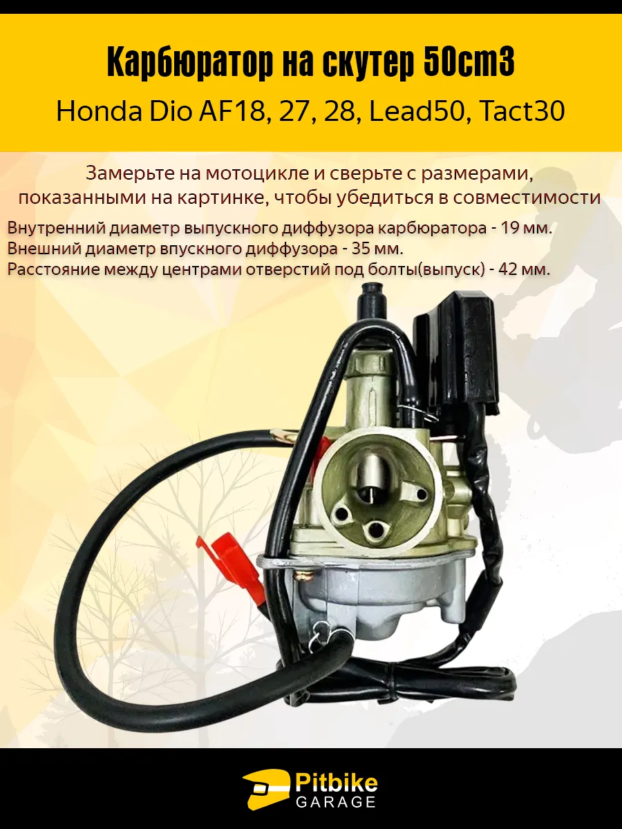 Технические параметры изделия соответствуют требованиям совместимости с оригинальными узлами. Внутренний диаметр выпускного диффузора составляет 19 мм, внешний диаметр впускного диффузора — 35 мм, а расстояние между центрами отверстий под болты на выпуске — 42 мм. Эти показатели позволяют корректно установить карбюратор и обеспечить надежное соединение с системой впуска и цилиндром двигателя. Правильное совпадение размеров играет важную роль в герметичности соединений.