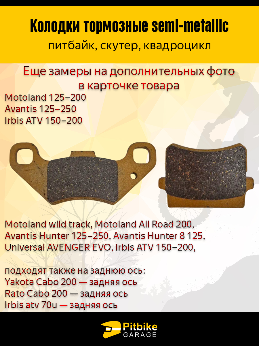 Данные колодки идеально совместимы с широким спектром техники: Motoland wild track, Motoland All Road 200, Avantis Hunter 125-200, Avantis Hunter 8 125, Universal AVENGER EVO, Irbis ATV 150-200, а также Авантис 250. Продукт подходит не только для передних тормозных суппортов, но и для задней оси на моделях Yakota Cabo 200, Rato Cabo 200 и Irbis ATV 70u.