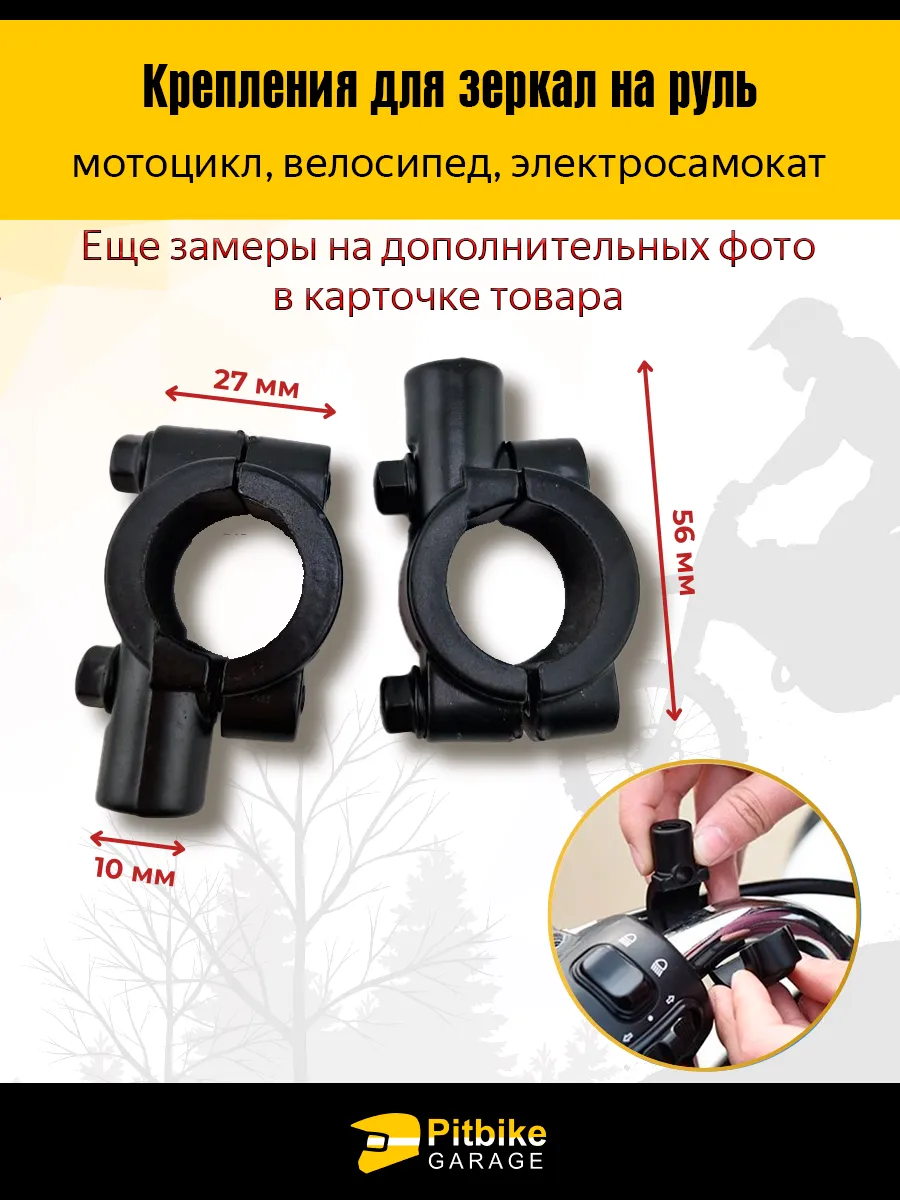 Универсальные металлические кронштейны для установки зеркал заднего вида на рулевые трубы диаметром от 22 до 25 мм. Подходят для всех видов велосипедов, электровелосипедов, электросамокатов, мопедов, скутеров, курьерских байков и мотоциклов малой кубатуры.