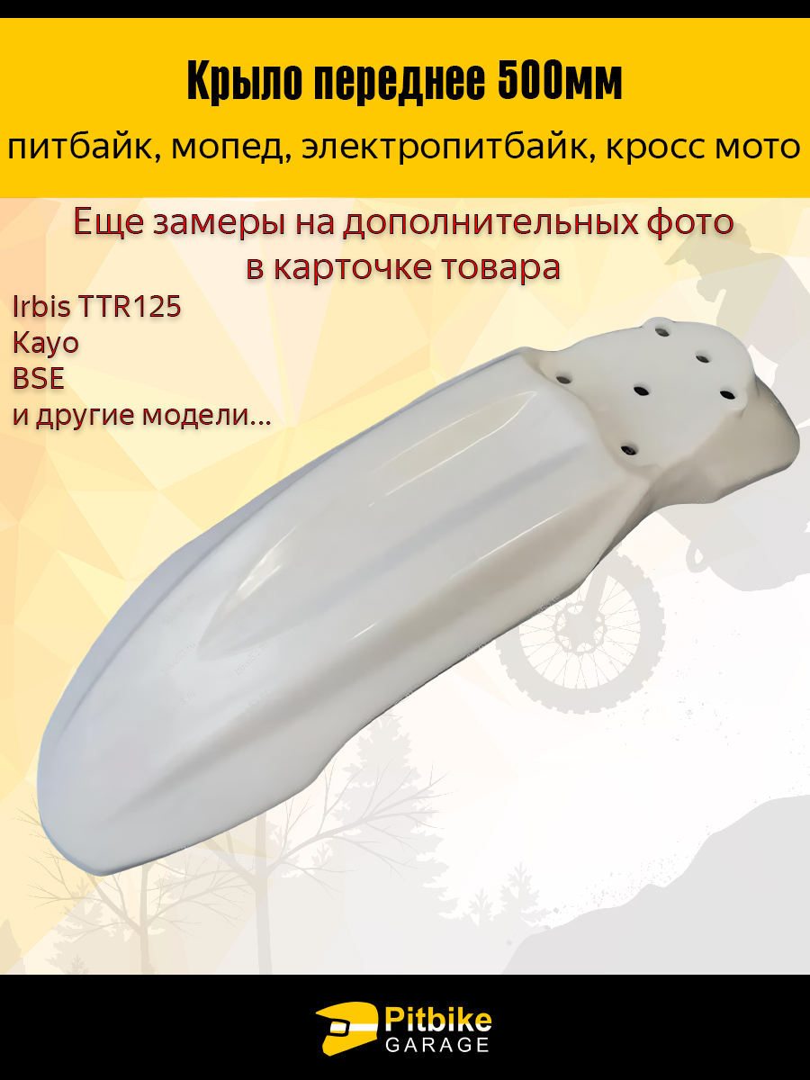 Переднее крыло длиной 500 мм предназначено для установки на питбайки, мопеды, электропитбайки и кроссовые мотоциклы. Изделие выполнено из прочного пластика, который сохраняет свою форму и не деформируется при вибрациях и внешних воздействиях. Цвет — белый, универсальный и подходящий под большинство стандартных расцветок техники.