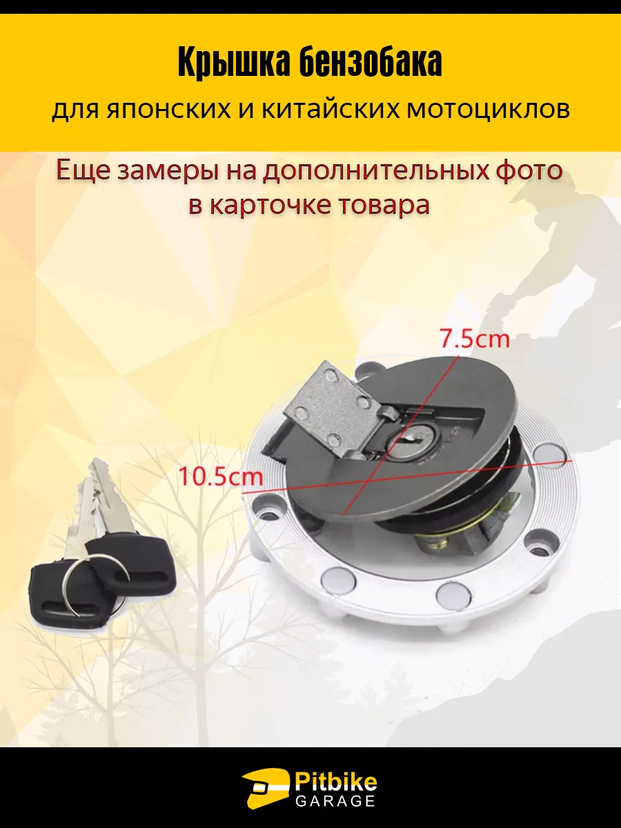 Универсальная крышка бензобака с замком – это идеальное решение для мотоциклистов, которые ценят качество, безопасность и практичность. Совместима с большинством моделей китайских и японских мотоциклов, в том числе с питбайками, эндуро и дорожными байками. Устанавливается на стандартное посадочное место диаметром 7,5 см, внешний диаметр — 10,5 см. Перед покупкой рекомендуем свериться с фото с замерами в карточке товара.