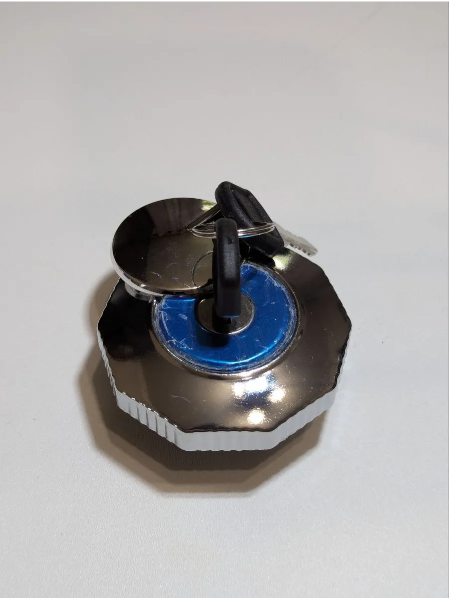 Изделие выполнено из прочного металла с хромированным покрытием, устойчивым к коррозии, царапинам и воздействию окружающей среды. Наружная часть крышки имеет рифленую поверхность, что упрощает откручивание даже в перчатках или при влажных руках. Центральная часть оборудована металлической створкой, защищающей замочную скважину от попадания пыли, воды и грязи.