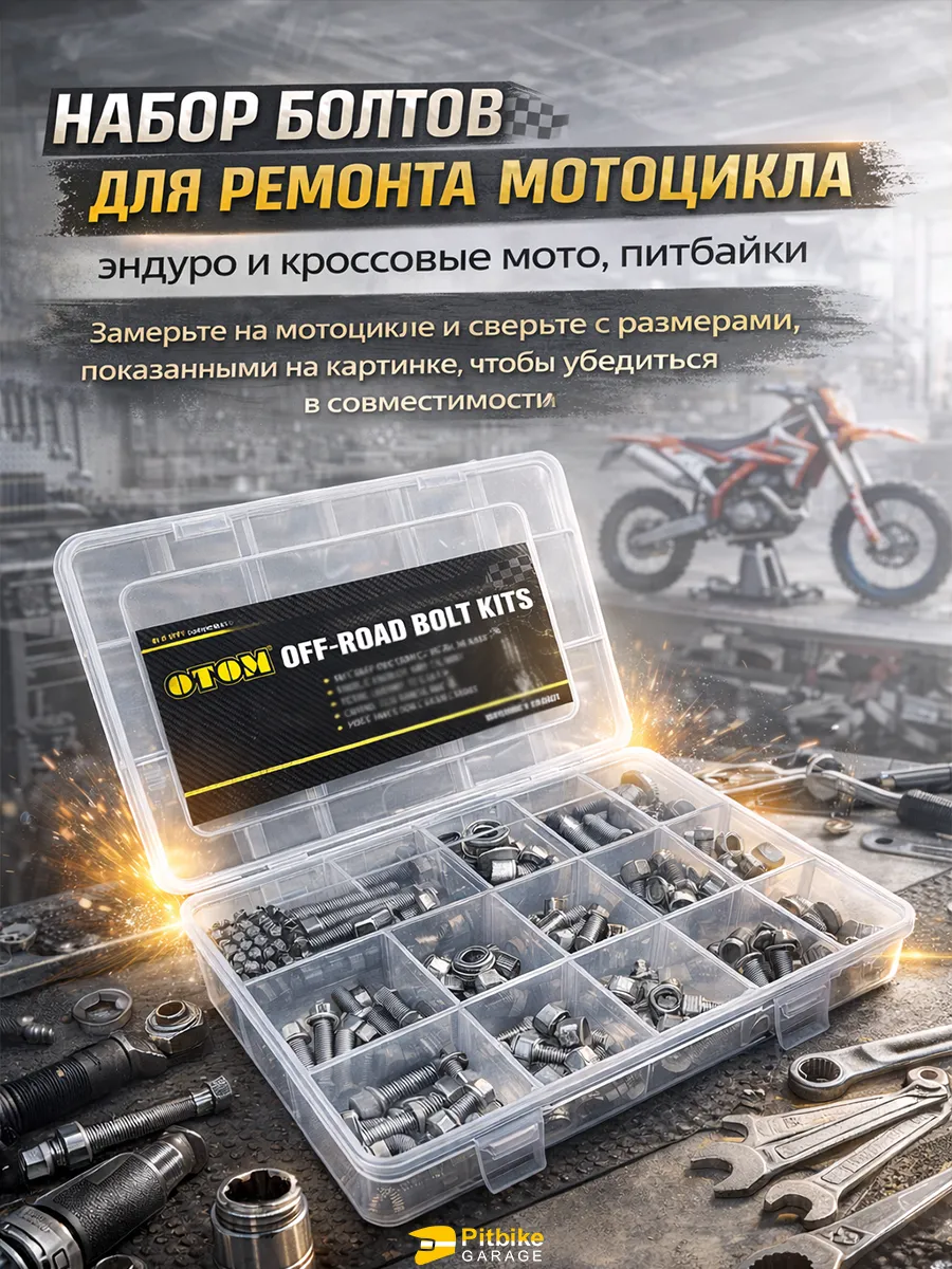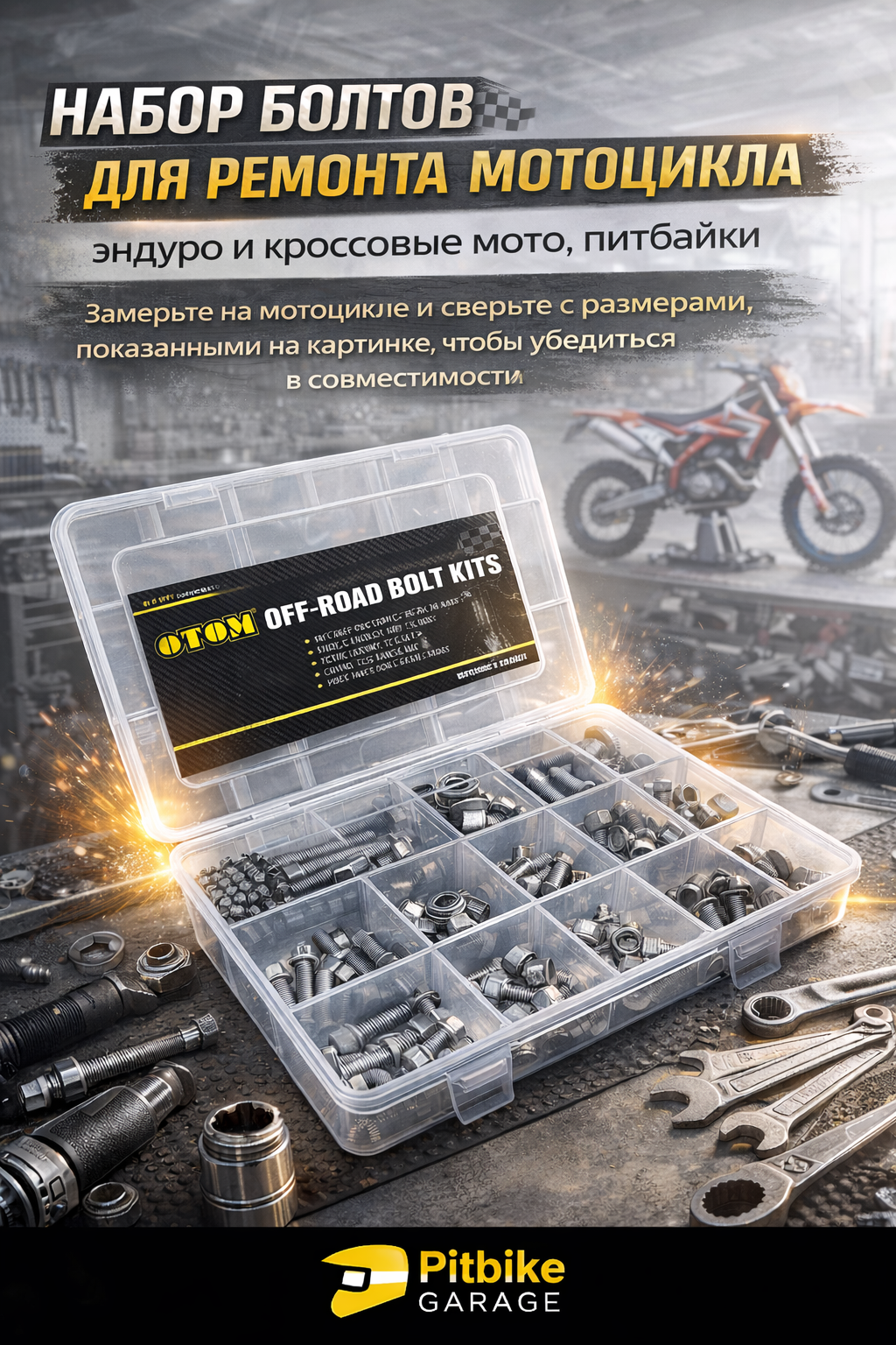 Набор болтов для ремонта мотоцикла — это универсальное и практичное решение для обслуживания, восстановления и дооснащения кроссовых мотоциклов, эндуро и питбайков. Комплект разработан с учётом реальных условий эксплуатации внедорожной техники и ориентирован на повышенные нагрузки, вибрации и агрессивную среду. Все элементы изготовлены из прочной стали с высокой устойчивостью к износу, что делает набор оптимальным выбором как для профессиональных мастерских, так и для самостоятельного ремонта.