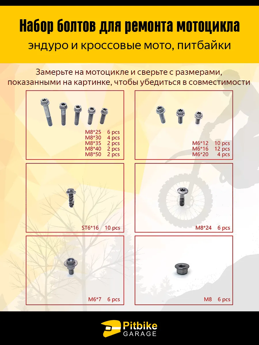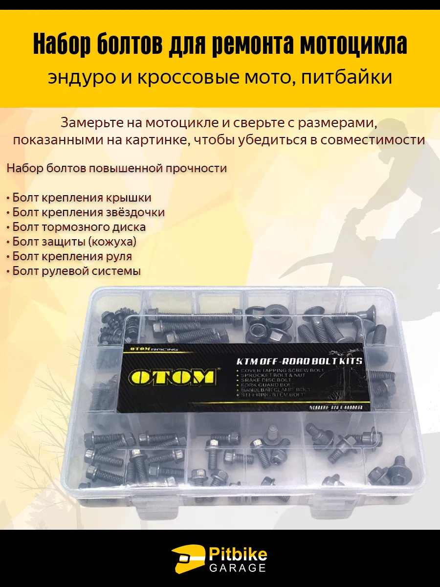 В набор входят болты наиболее востребованных размеров, применяемые при обслуживании ключевых узлов мотоцикла: крышек двигателя, звёздочек, тормозных дисков, защиты (кожуха), рулевого управления и элементов рулевой системы. Подбор типоразмеров позволяет закрыть основные потребности при ремонте и замене крепежа без необходимости докупать отдельные позиции. Перед установкой рекомендуется произвести замеры на мотоцикле и сверить их с размерами, указанными на изображении, чтобы гарантировать полную совместимость.