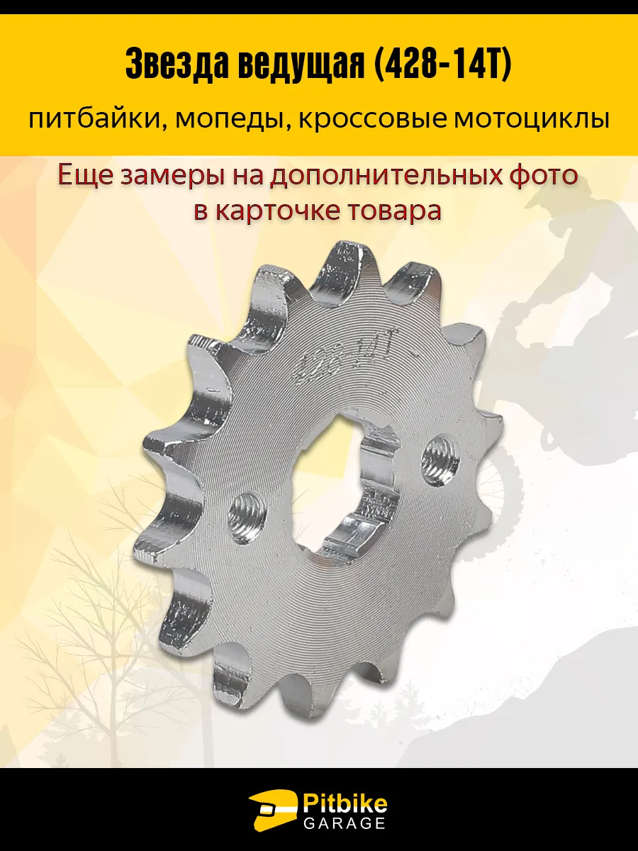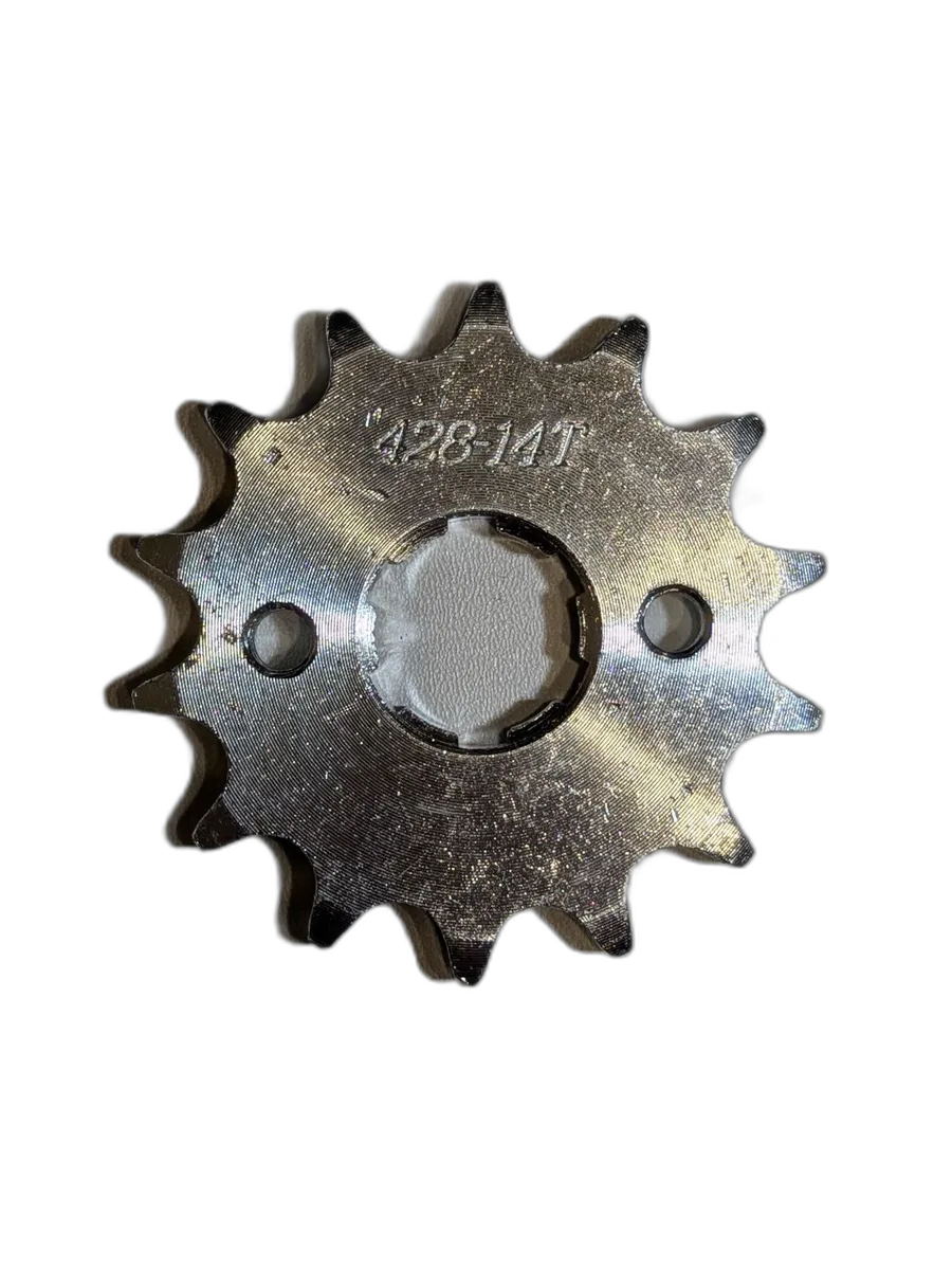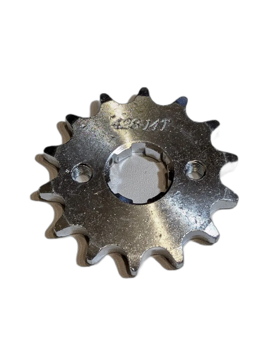 Ведущая звезда 428-14T для мотоцикла, питбайка, эндуро и кроссового байка — это прочная и долговечная деталь, обеспечивающая надежную передачу крутящего момента от двигателя к заднему колесу. Изготовлена из качественной закаленной стали, рассчитана на цепь 428 и вал диаметром 20 мм, с количеством зубьев 14 и креплением под болты М6.