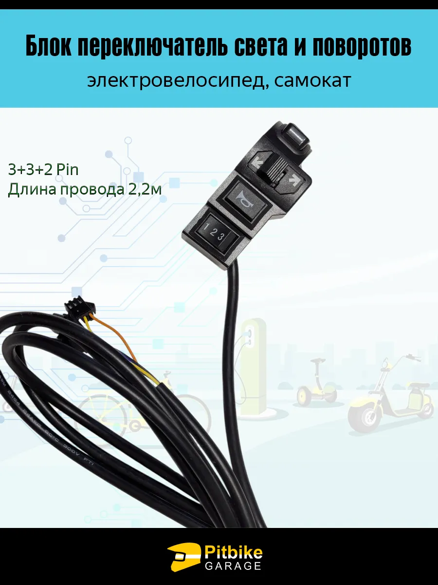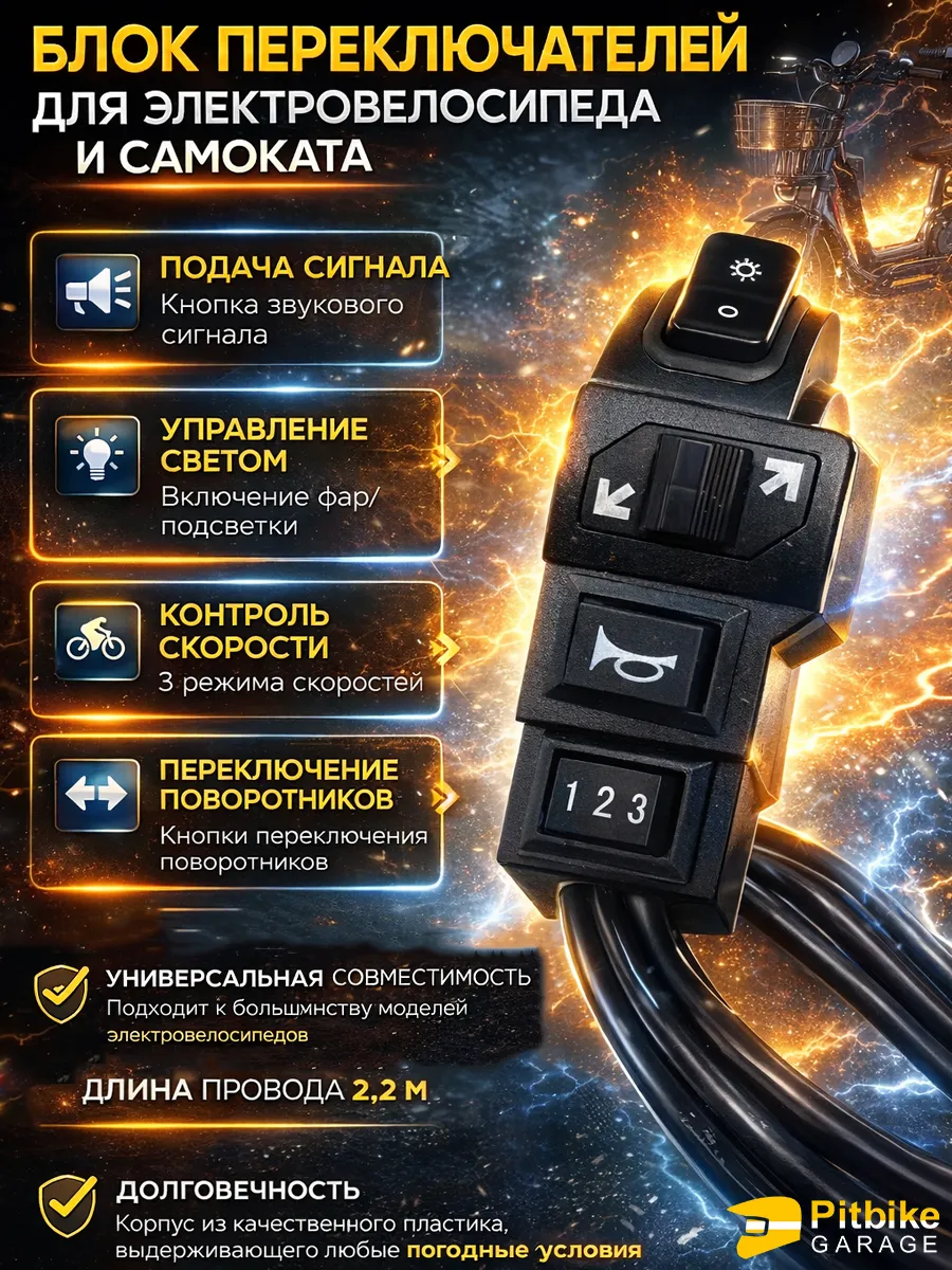 Многофункциональный блок переключателей предназначен для управления ключевыми системами электросамокатов и электровелосипедов. Устройство объединяет управление освещением, поворотниками, звуковым сигналом и режимами скорости, повышая комфорт, безопасность и удобство эксплуатации электротранспорта.