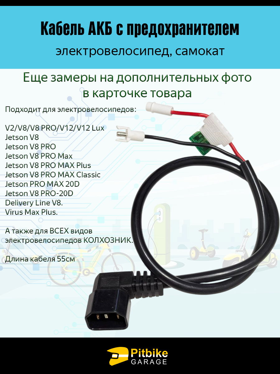 Изделие совместимо с широким модельным рядом электровелосипедов и электросамокатов, включая линейки V2, V8, V8 PRO, V12, V12 Lux, Jetson V8, Jetson V8 PRO, Jetson V8 PRO Max, Jetson V8 PRO MAX Plus, Jetson V8 PRO MAX Classic, Jetson PRO MAX 20D, Jetson V8 PRO-20D, Delivery Line V8, Virus Max Plus, а также со всеми типами электровелосипедов КОЛХОЗНИК. Универсальность применения делает кабель востребованным как для замены штатной проводки.
