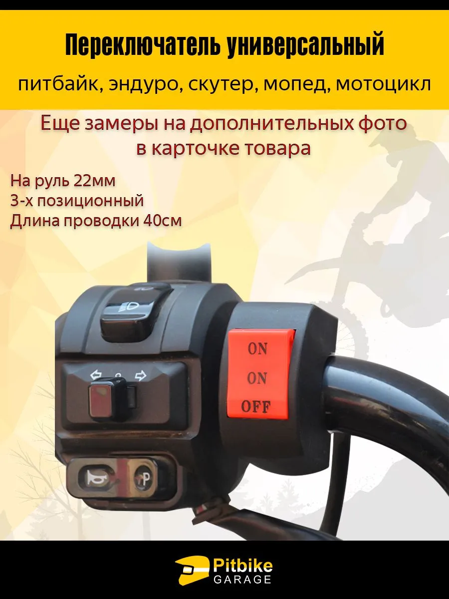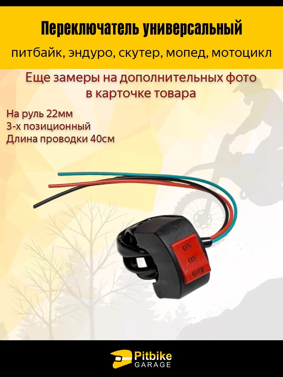 Универсальный 3-х проводной переключатель для мотоцикла, питбайка, скутера, мопеда — крепление на руль 22 мм, управление светом и сигналами