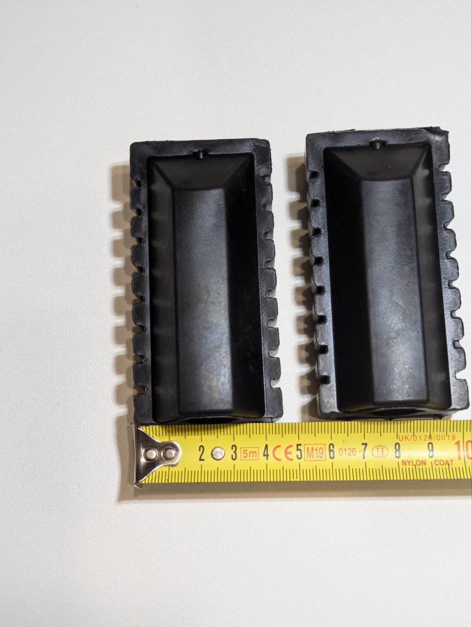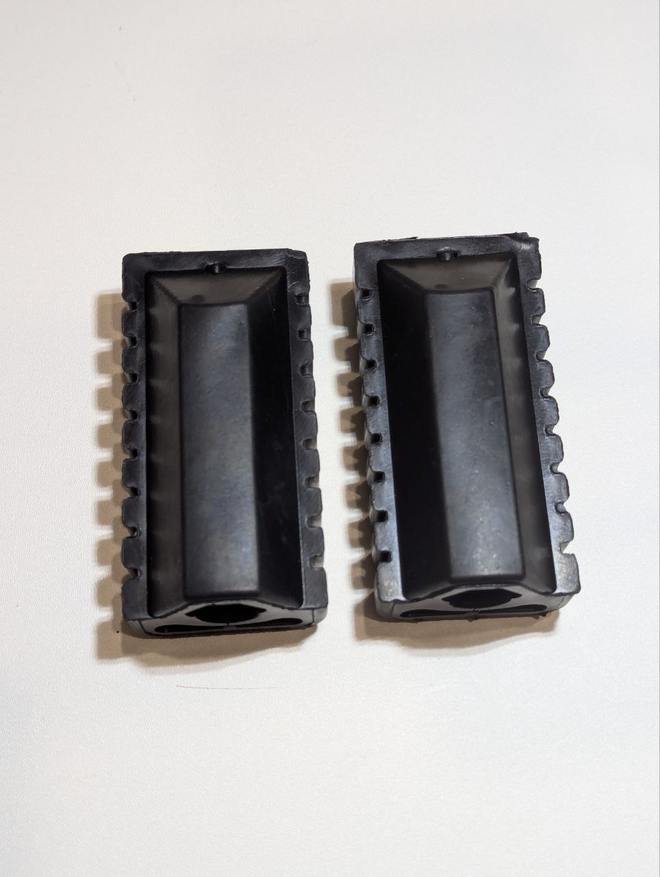 - Точное соответствие по размеру. Внешние габариты: 90 мм длина, 45 мм ширина. Внутри – овальное отверстие под стандартные мопедные подножки.