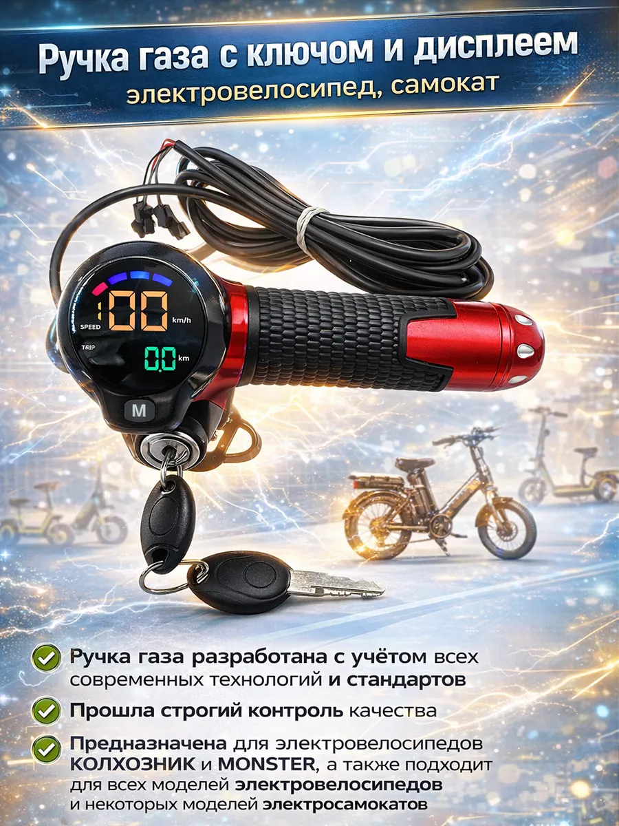 Ручка газа с ключом и встроенным дисплеем — это функциональный элемент управления, разработанный для современных электровелосипедов и электросамокатов, где важны точность отклика, надёжность и информативность. Модель предназначена для установки на технику с напряжением 36–72 В и полностью совместима с популярными линейками V2, V8, V8 PRO, V12, V12 Lux, Jetson V8, Jetson V8 PRO, Jetson V8 PRO Max, Jetson V8 PRO MAX Plus, Jetson V8 PRO MAX Classic, Jetson PRO MAX 20D, Jetson V8 PRO-20D, Delivery Line V8, Virus Max Plus, а также подходит для всех видов электровелосипедов КОЛХОЗНИК.