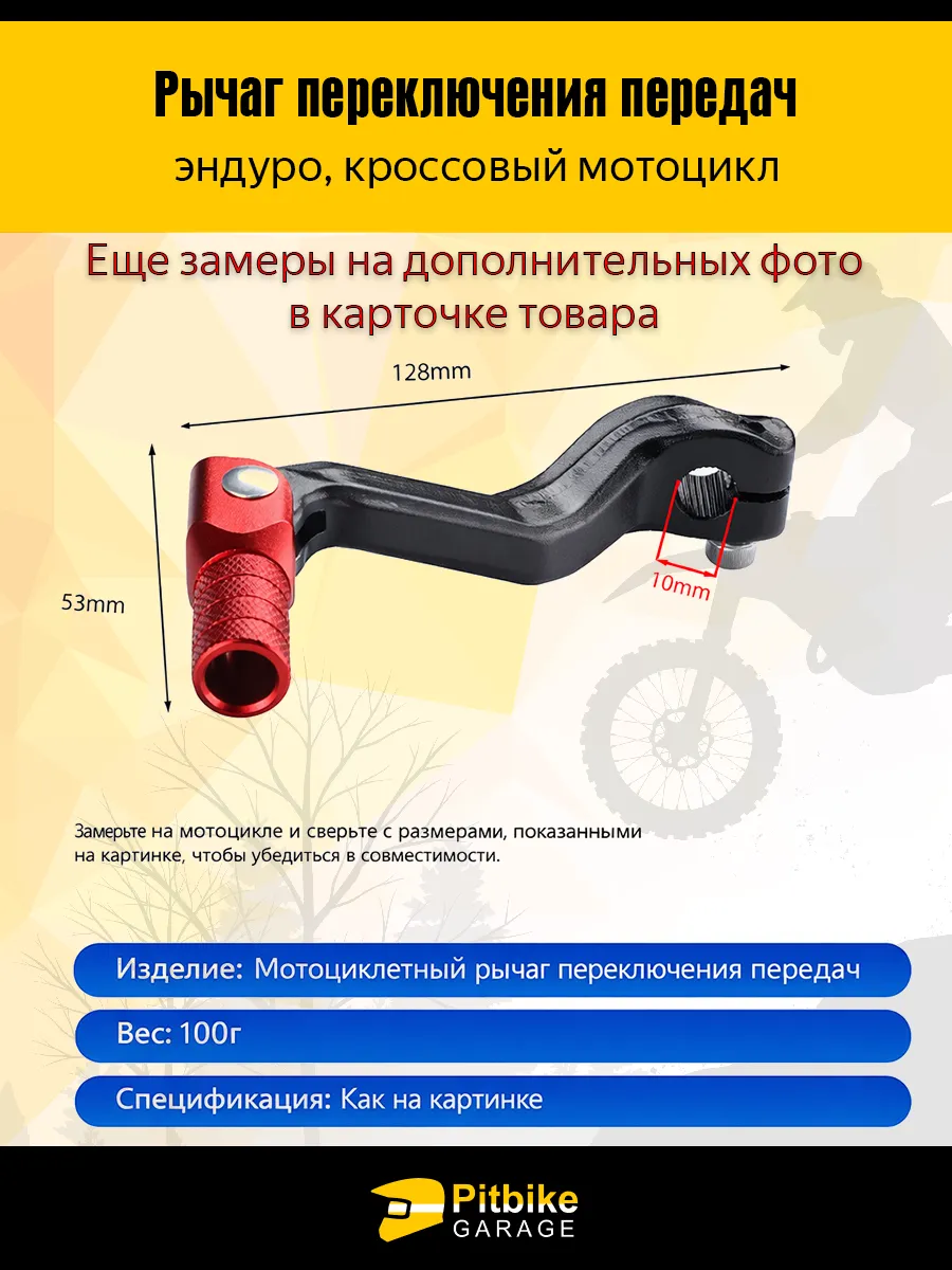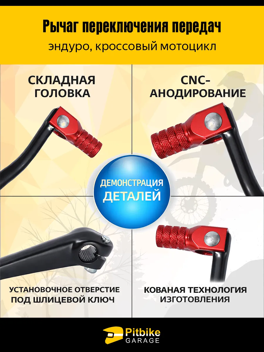 Кованый алюминиевый рычаг переключения передач предназначен для установки на мотоциклы и питбайки популярных брендов, включая IRBIS, KAYO, Kawasaki, Lifan, Ataki, ABM, Avantis, BRZ, BSE, Bars, Full Crew, Hasky, JMC, Motoland, Minsk (Минск), PWR Racing, Patron, Pitster Pro, Racer, Progasi, Regulmoto, Stels. Данная модель разработана как усиленная и износостойкая замена штатного рычага и ориентирована на повседневную эксплуатацию, бездорожье, мотокросс и активный стиль езды.