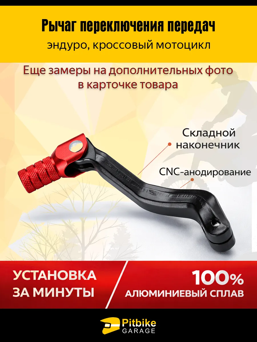 Рабочая поверхность рычага обработана методом CNC, что гарантирует точную геометрию, идеальную посадку и стабильную работу механизма переключения передач. Анодированное покрытие защищает алюминий от коррозии, окисления и механического износа, а также придает изделию аккуратный внешний вид. Черное основание и красный наконечник визуально подчеркивают спортивный характер мотоцикла.