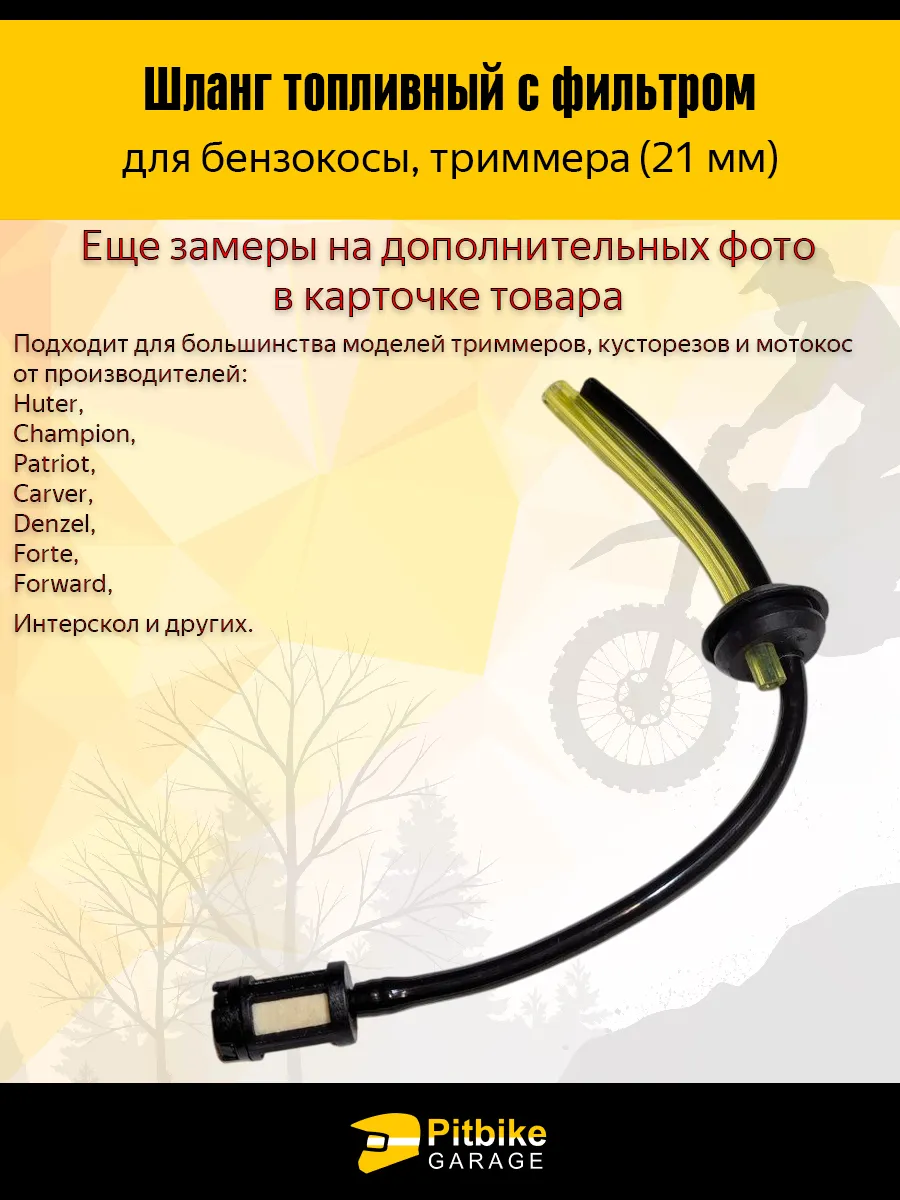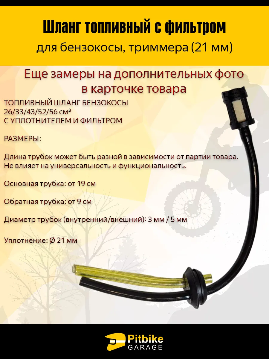 Топливопровод рассчитан на установку в бак с отверстием диаметром 21 мм. Подходит для большинства моделей триммеров, кусторезов и мотокос. Рекомендуется проверить наличие двух шлангов (а не трёх, как в моделях с сапуном) и диаметр посадочного отверстия бака перед покупкой.