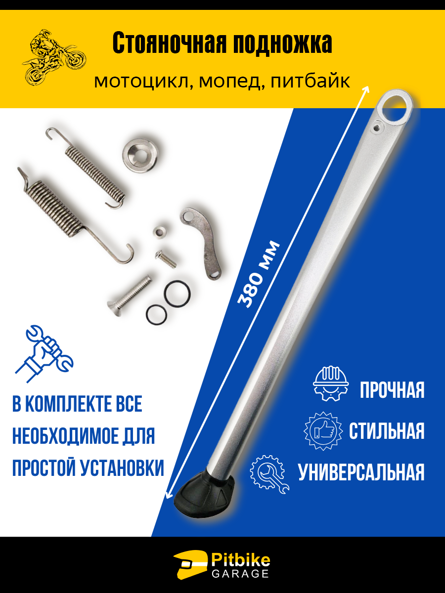 Назначение: Подходит для замены штатной подножки или в качестве дополнительной опоры. Обеспечивает стабильную поддержку мотоцикла на любой поверхности: асфальт, гравий, грунт.