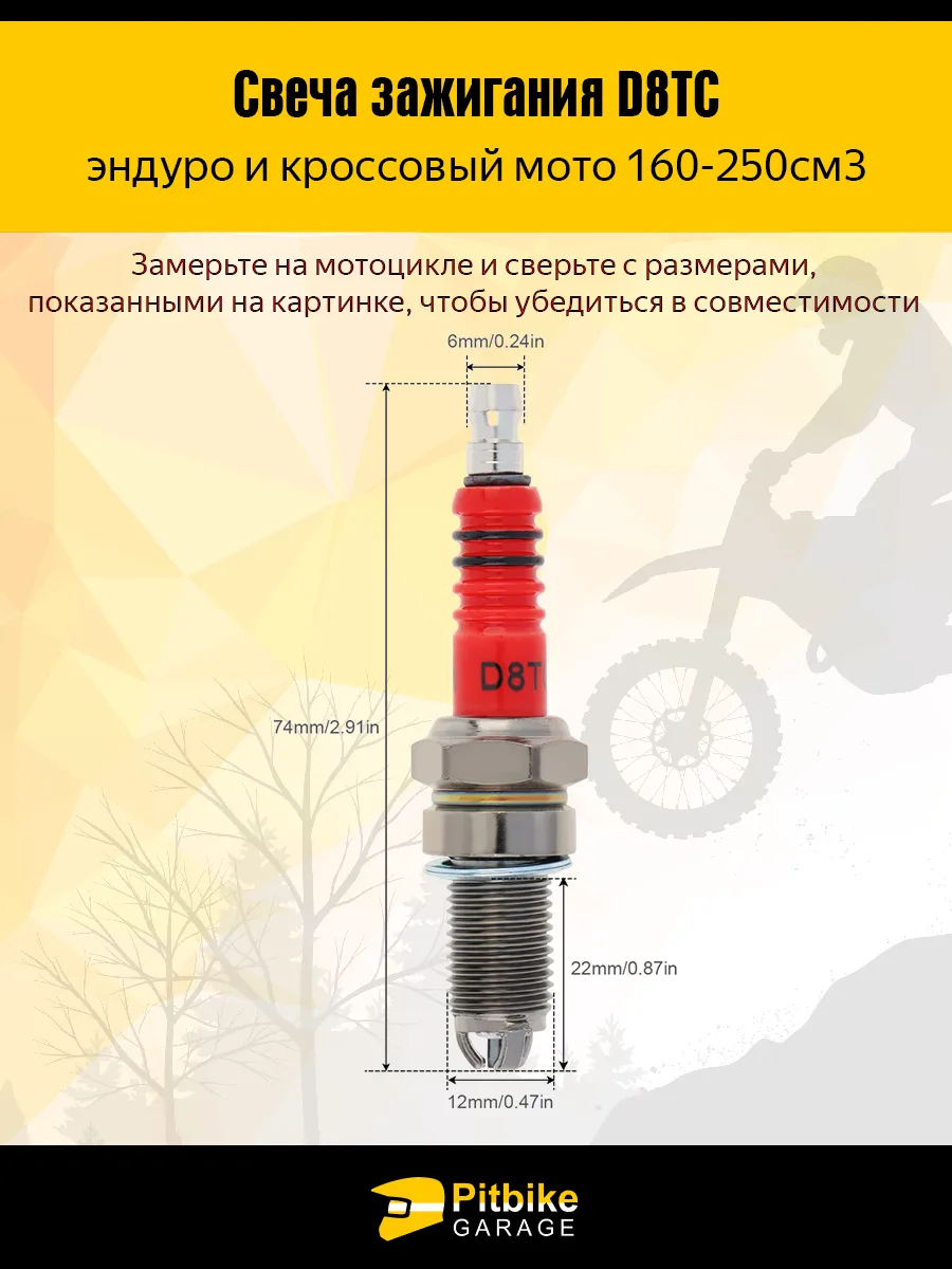 Свеча зажигания D8TC подходит для мотоциклов и питбайков таких брендов, как IRBIS, KAYO, Kawasaki, Lifan, Ataki, ABM, Avantis, BRZ, BSE, Bars, Full Crew, Hasky, JMC, Motoland, Minsk (Минск), PWR Racing, Patron, Pitster Pro, Racer, Progasi, Regulmoto, Stels, а также других моделей с аналогичными характеристиками двигателя.