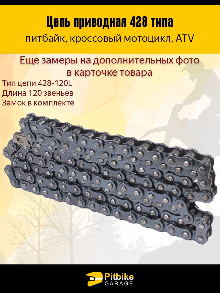 Цепь имеет 120 звеньев и подходит под звёздочки стандарта 428. Это один из самых популярных форматов в сегменте мото- и мотокросс-техники. Цепь поставляется в комплекте с замком, что облегчает установку и последующее обслуживание. Прочная стальная конструкция звеньев обеспечивает устойчивость к высоким нагрузкам, ударному воздействию и длительной эксплуатации без растяжения.