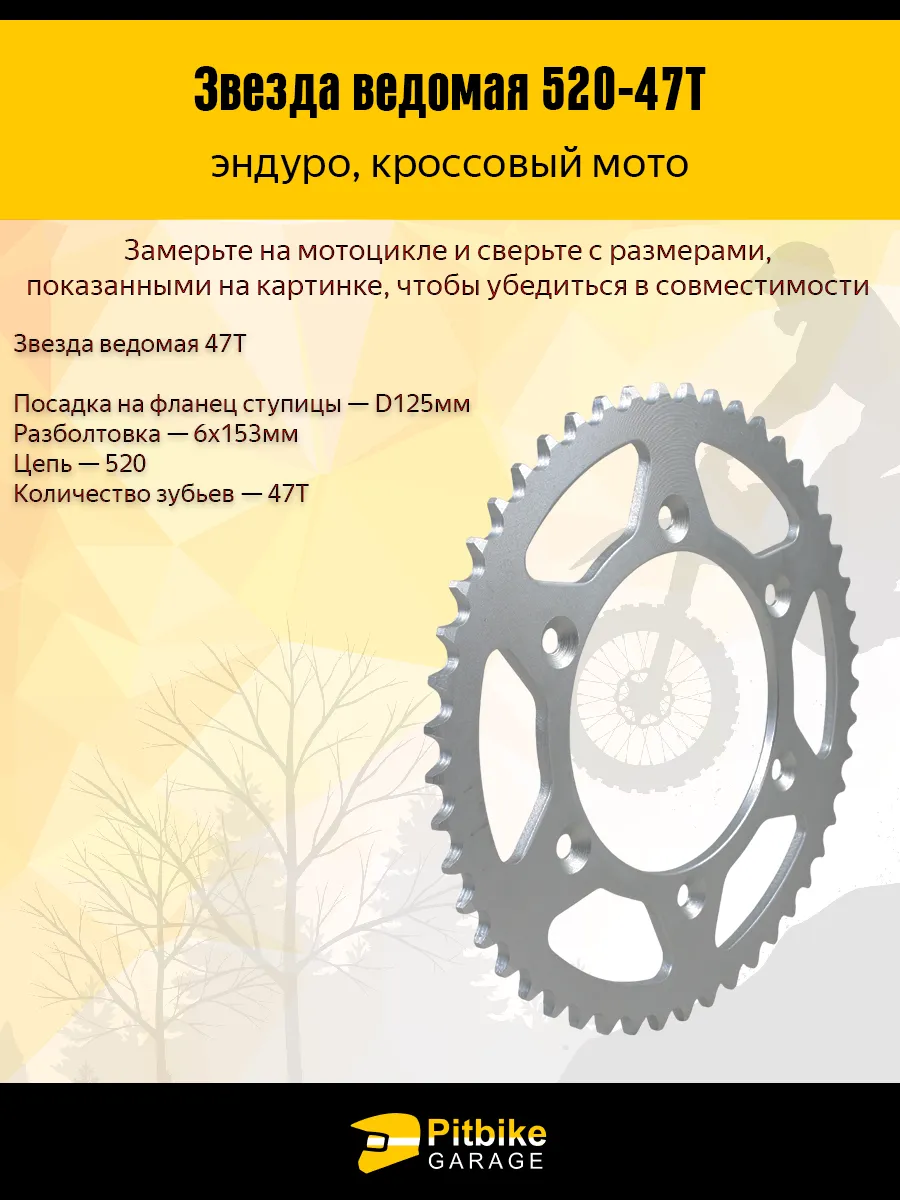 Изделие выполнено из прочного металлического сплава, устойчивого к износу, ударным нагрузкам и деформации. Точная геометрия зубьев обеспечивает равномерное распределение нагрузки на цепь, снижает её растяжение и продлевает срок службы всей трансмиссии. Посадка на фланец ступицы — D125 мм, разболтовка — 6×153 мм, что гарантирует корректную установку без доработок при соблюдении параметров мотоцикла. Перед покупкой рекомендуется проверить размеры на вашем мотоцикле, чтобы убедиться в полной совместимости.