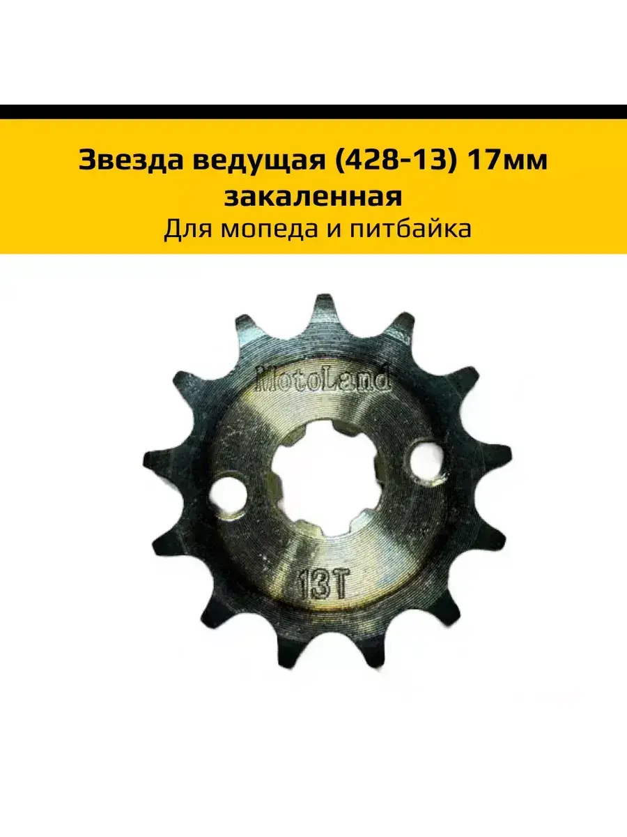 Ведущая звезда 428-13 (17 мм) — для питбайков и мопедов Ищете надёжную, износостойкую и долговечную звезду ведущую для питбайка или мопеда? Представляем ведущую звезду 428-13 на вал 17 мм — идеальный выбор для любителей мототехники, которым важна стабильность, производительность и безопасность. Совместимость: мопеды и питбайки с цепью 428, вал 17 мм Прочность: изготовлена из закалённой стали, устойчива к износу и высоким нагрузкам Универсальность: подходит для моделей Kayo 125, Motoland Apex 125, Ataki Prime 125, Irbis TTR и других — сверяйте размеры с фото и карточкой товара Лёгкая установка: точная форма, чёткая посадка Назначение: передача усилия с двигателя на колесо, обеспечивает стабильную и плавную езду даже в условиях бездорожья Вес: 143 г — оптимально для кросса, эндуро и городских поездок Производство: Китай Характеристики: Тип: ведущая звезда Модель: 428-13 Вал: 17 мм Материал: закалённая сталь Цвет: металлический Вес с упаковкой: 143 г Крепление: универсальное (без болтов) Комплектация: звезда – 1 шт. Обновите трансмиссию своего питбайка или мопеда с помощью прочной, точной и надёжной ведущей звезды 428-13. Повышенная устойчивость к нагрузкам делает её идеальной даже для агрессивного стиля езды.
