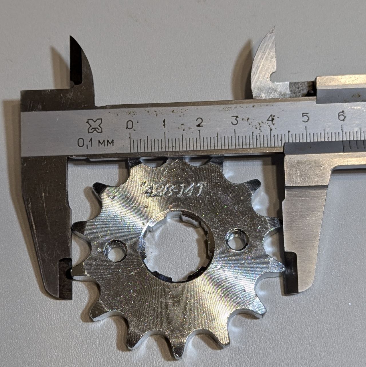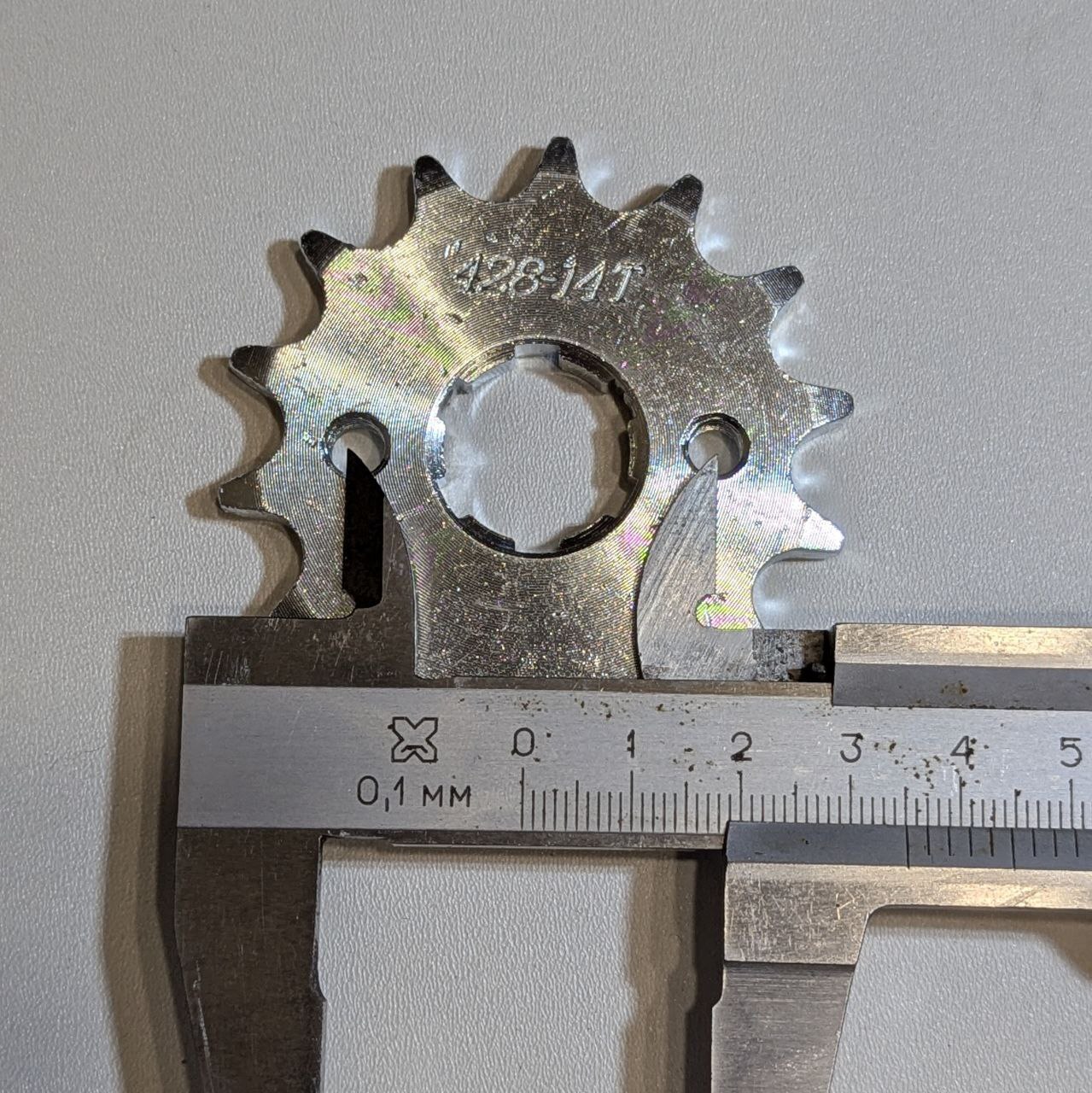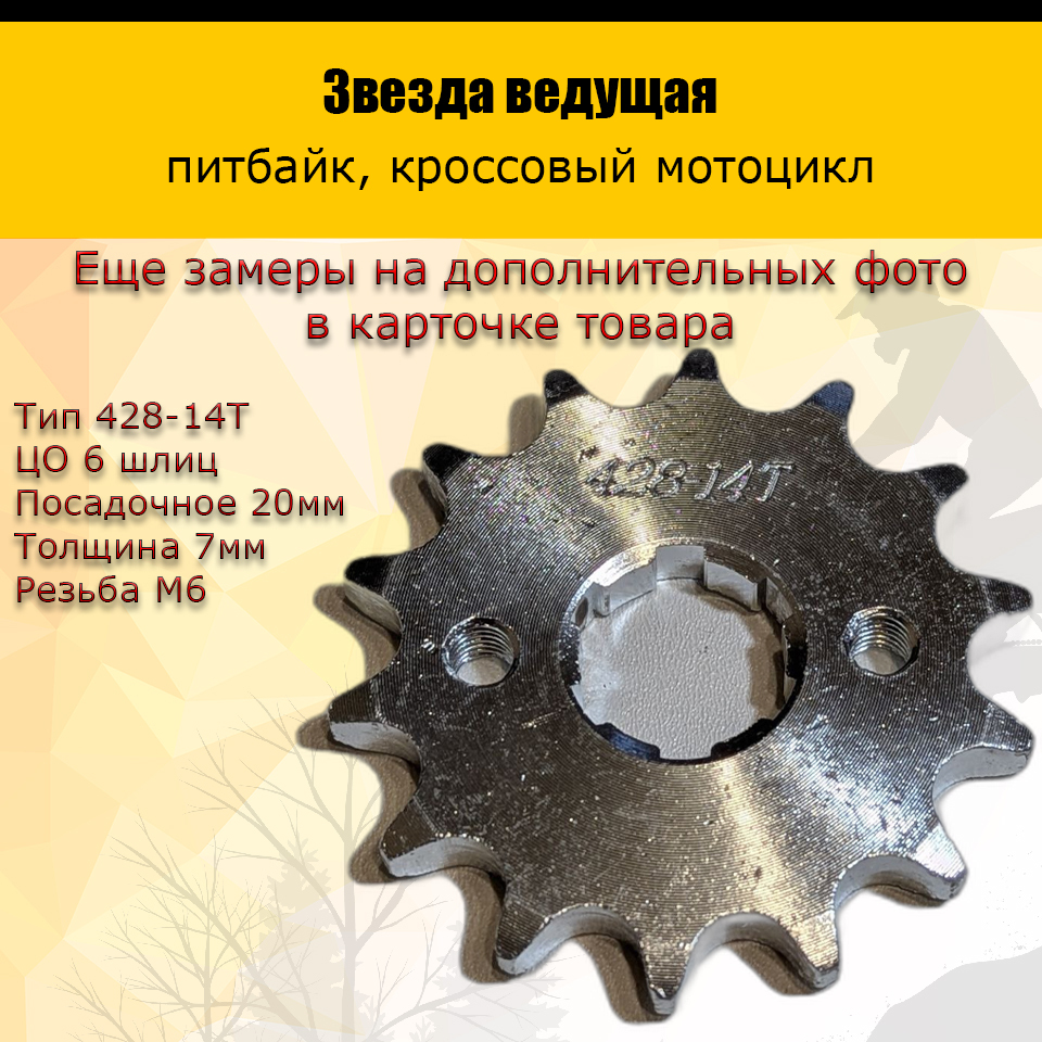 Ведущая звезда 428-14T для мотоцикла, питбайка, эндуро и кроссового байка — это прочная и долговечная деталь, обеспечивающая надежную передачу крутящего момента от двигателя к заднему колесу. Изготовлена из качественной закаленной стали, рассчитана на цепь 428 и вал диаметром 20 мм, с количеством зубьев 14 и креплением под болты М6.