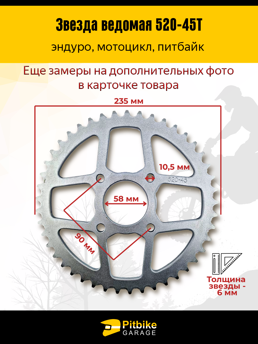 Звезда задняя 45 зубьев 520 шаг — усиленная, стальная для питбайка, эндуро, мотоцикла Диаметр 235 мм Вес 865 г Диаметр посадочного отверстия 90 мм Толщина 6 мм Идеальное решение для замены штатной задней звезды на мотоциклах, питбайках и эндуро! Увеличенный ресурс, точная обработка и прочная конструкция делают эту звезду выбором №1 для профессионалов и любителей внедорожной езды. ХАРАКТЕРИСТИКИ: Количество зубьев: 45 Шаг цепи: 520 (стандарт для большинства питбайков и кроссовых мотоциклов) Внешний диаметр: 235 мм Толщина звезды: 6 мм Диаметр крепежных отверстий: 10,5 мм Расстояние между крепежными отверстиями: 90 мм Вес: 865 грамм Материал: усиленная сталь с защитным антикоррозийным покрытием Цвет: серебристый (цинковка) Маркировка: выбитая "520-45" на корпусе СОВМЕСТИМОСТЬ: Подходит для большинства моделей: питбайков (Kayo, BSE, Motoland, Apollo, WELS, IRBIS и др.) эндуро-мотоциклов кроссовых байков самодельных проектов на базе двигателя 125cc, 140cc, 150cc, 160cc ПРЕИМУЩЕСТВА: Усиленная сталь высокой прочности — устойчива к износу, не "разъедает" цепь Точная фрезеровка зубьев — обеспечивает ровную посадку цепи и уменьшает шум при езде Цинковое антикоррозийное покрытие — защищает от влаги и ржавчины Лёгкая установка — соответствует штатным размерам Подходит под цепь 520 — один из самых популярных стандартов ПРИМЕНЕНИЕ: Идеальна для: Тюнинга под увеличение тяги (45 зубьев обеспечивают повышенную тягу и уверенный старт) Замены изношенной звезды Подготовки мотоцикла к соревнованиям или бездорожью Повседневной эксплуатации с повышенными нагрузками